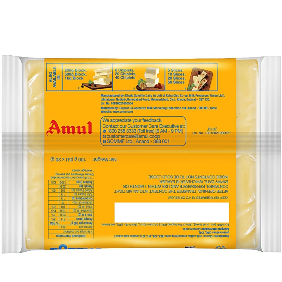 Amul Cheese Slices (100g pack, 5 slices) ekdum rich aur creamy processed cheese hai jo **pure milk** se bana hai. Har slice hygienically packed hai, jo snacks aur meals ko quick aur tasty banata hai. Ye cheese slices sandwiches, burgers, wraps, parathas aur even salads ke liye best hai.