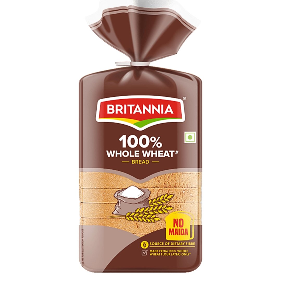 Enjoy wholesome goodness with **Britannia 100% Whole Wheat Bread**, made from 100% atta (whole wheat flour) and absolutely **no maida**. Each slice is soft, light, and rich in fibre, making it the perfect choice for a healthy breakfast or snack.